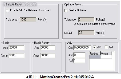 通過Softmotion的算法,新一代運動控制卡可根據(jù)用戶所提供的圖形數(shù)據(jù),自動規(guī)劃出優(yōu)化圖形路徑規(guī)劃,以縮短不必要的路徑并提升切割速度與平滑度。如此一來可減少不必要的重復(fù),大大的提升產(chǎn)能。 利用Softmotion內(nèi)的前瞻規(guī)劃(LookAhead)功能,當(dāng)運動軌跡有較大角度的轉(zhuǎn)折時,Softmotion會自動計算并提早降速,讓機構(gòu)可以順應(yīng)平滑的速度,平順的完成軌跡的移動。如此復(fù)雜功能的實現(xiàn),用戶僅需要輸入3個系統(tǒng)參數(shù),分別是「最大速 (Max. Velocity)」、「最大加速度 (Max. Acceleration)」以及「容許誤差量 (Tolerance)」(如圖十二)。通過Softmotion的內(nèi)部規(guī)劃,即可達(dá)成復(fù)雜圖形的軌跡運動。