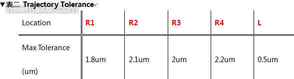 因加工是由4,500個小線段所組成的圖形(如圖十三),并特別取得四個彎角段及四段長直線段的誤差數(shù)據(jù)(如表二),而整體激光加工的彎角軌跡誤差小于2.2um,長直線端的軌跡誤差更小于0.5um。 通過以下區(qū)域放大圖片中,可清楚的看到激光能量是均勻地控制在一定范圍,并顯示實際加工軌跡是平滑無抖動。也由此可左證凌華科技新一代的運動控制卡不僅能實現(xiàn)一般多軸插補運動,同時可實現(xiàn)在如激光切割等復(fù)雜的圖形加工。而板上所實現(xiàn)的實時激光強度與回饋速度追隨,更可有效節(jié)省系統(tǒng)CPU資源,并保證其加工效能。