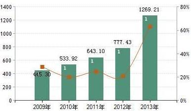 圖表1:2009-2013年光纖光纜行業(yè)銷售收入及增長率變化趨勢圖(單位:億元,%)