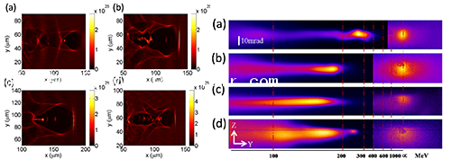 圖2.隨著等離子體密度的漸變,呈現(xiàn)出四種不同的注入、加速方式(左圖,模擬)。實(shí)驗(yàn)中再現(xiàn)了與之一一對應(yīng)的電子能譜和與之緊密關(guān)聯(lián)的回旋輻射前向分布(右圖)。