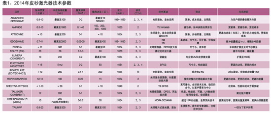 在撰寫(xiě)這篇文章時(shí),我們與所有參加了2013年調(diào)查的公司進(jìn)行了聯(lián)系,并請(qǐng)他們更新了數(shù)據(jù)。此外,許多不在之前名單上的公司也被邀請(qǐng)參與此次調(diào)查,2013年調(diào)查時(shí)他們或是沒(méi)有囊括入名單中,或是不愿意參與,或是當(dāng)時(shí)他們還沒(méi)有涉足超短脈沖激光器領(lǐng)域。因此本次的名單更為完整,但這絕不是一個(gè)完整的調(diào)查。名單被劃分為皮秒激光器和飛秒激光器;公司在表中的位置是由他們自己選擇的。