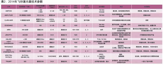 表2顯示了飛秒激光器的12家供應(yīng)商,2013年是9家。只有3家供應(yīng)商列出了輸出功率超過(guò)50W的激光器。值得注意的一點(diǎn)是,Raydiance表示未來(lái)計(jì)劃擴(kuò)展至1030nm(取代1553nm)以便能提供更高的諧波。在300fs脈沖寬度,基本波長(zhǎng)和較高的諧波對(duì)大多數(shù)材料的加工質(zhì)量來(lái)說(shuō)不會(huì)造成太大的區(qū)別,但有機(jī)物和玻璃等材料仍然會(huì)有比較顯著的差異。特別是金屬在基本輸出功率下就可以實(shí)現(xiàn)邊緣整齊的加工。然而,如果需要目標(biāo)上的光斑尺寸很小,那么紫外(UV)光子可能是必要的選擇,即使是對(duì)飛秒激光器來(lái)說(shuō)。我們到底需要多短的脈沖寬度?對(duì)于大多數(shù)應(yīng)用來(lái)說(shuō),其實(shí)沒(méi)有必要追求150fs以下的脈沖寬度,因?yàn)檫@只能給加工零件的質(zhì)量帶來(lái)邊際收益,但超短脈沖激光器的光譜展寬使得光學(xué)元件問(wèn)題變得更具挑戰(zhàn)性。即使飛秒光子通常能在目標(biāo)上實(shí)現(xiàn)邊緣干凈整齊的切割,但皮秒對(duì)大多數(shù)應(yīng)用來(lái)說(shuō)已經(jīng)足夠好。最后,當(dāng)很短的脈沖聚焦到很小的光斑時(shí),空氣擊穿會(huì)帶來(lái)麻煩,所以可能需要保證光束傳輸系統(tǒng)的潔凈。