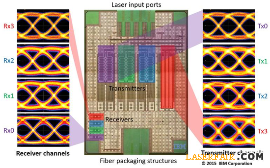 通過(guò)一種稱之為“多路復(fù)用”的技術(shù),IBM的研究員演示了如何使芯片通過(guò)單根光纖收發(fā)4種不同顏色的紅外光信號(hào)。目前,單一鏈路的傳輸速率為每秒25 gigabits,4路一起最高為100Gbps。在這一速度下,一張藍(lán)光碟片中容量為25 gigabyte的電影只需兩秒即可傳輸完畢。