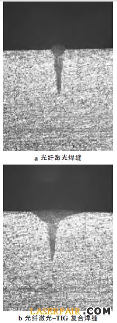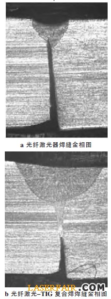 圖5 光纖激光與光纖激光-TIG 復(fù)合焊的金相圖對比