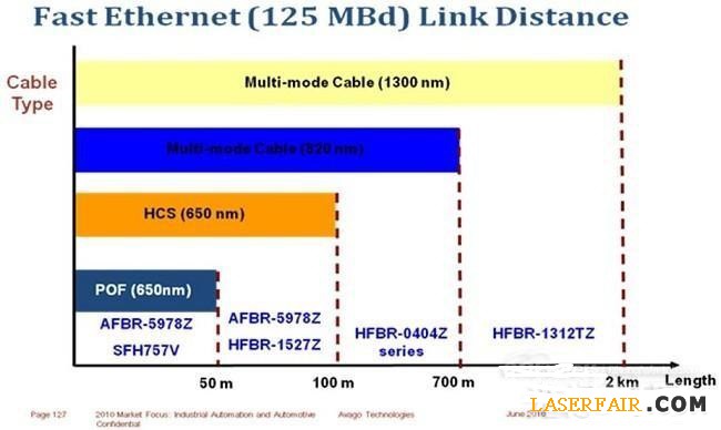 雖然銅電纜和光纖都可以作為傳輸媒介,但光纖解決方案為系統(tǒng)設(shè)計(jì)工程師提供了許多明顯的好處,相較于銅電纜解決方案,通過塑料光纖(POF, Plastic Optical Fiber)或較長距離時(shí)硬包層石英(HCS, Hard Clad Silica)光纖運(yùn)行的工業(yè)用快速以太網(wǎng)(Fast Ethernet)有許多優(yōu)勢,采用銅電纜的通信鏈路容易受到電磁場的干擾,并且也會(huì)發(fā)出可能干擾其他設(shè)備的電磁波,而光纖鏈路則不會(huì)受到電磁場影響,也不會(huì)產(chǎn)生任何電磁干擾(EMI, Electro Magnetic Interference)。