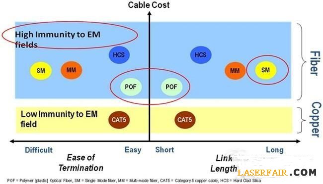 由于光纖鏈路媒介基本上采用玻璃或塑膠,因此在絕緣和隔離特性上遠(yuǎn)比常見的銅電纜優(yōu)秀許多,原因是它們不會(huì)受到EMI的干擾,如圖2中以紅色標(biāo)示的5米長POF或100米長HCS光纖就提供了高噪聲環(huán)境下相對于銅電纜線的許多優(yōu)勢。采用光纖解決方案,在光纖本身或者是光纖和銅電纜間不會(huì)有相互干擾問題,使得數(shù)據(jù)傳輸更加安全。光纖對于閃電電擊有較高的耐受力,并且有助于消除接地環(huán)路所造成的錯(cuò)誤,在面臨惡劣條件或可能暴露的環(huán)境時(shí),適當(dāng)使用光纖解決方案可以藉由通過降低閃電電擊可能帶來的損害以及電氣火花造成的沖擊而提高安全性。