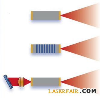 QC激光器的基本結(jié)構(gòu)包括FP-QCL(上圖)、DFB-QCL(中圖)和ECqcL(下圖)。增益介質(zhì)顯示為灰色,波長(zhǎng)