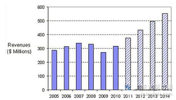 圖1 功率在1kW以下各種中紅外激光器的市場營業(yè)收入