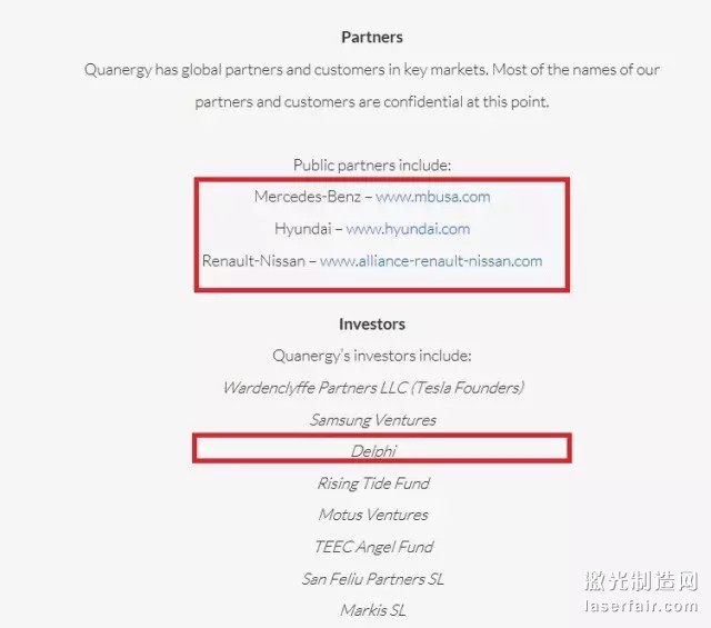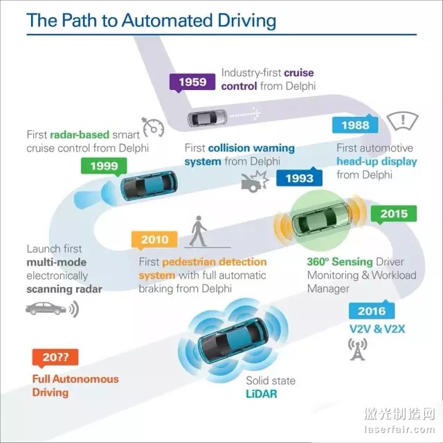 說到激光雷達(dá)產(chǎn)品,給人的第一印象就是它不可能很快的在汽車上量產(chǎn)。因此基本上主流的激光雷達(dá)公司的主營(yíng)業(yè)務(wù)都不是汽車。比如Velodyne作為一家硅谷公司,雖然參加了多次無人駕駛挑戰(zhàn)賽,但其大客戶仍然是工程機(jī)械公司,比如卡特彼勒。而IBEO這家德國(guó)公司的主營(yíng)業(yè)務(wù)則仍然在工業(yè)安防保護(hù)上。因此汽車業(yè)務(wù)上,IBEO和傳統(tǒng)汽車零件供應(yīng)商法雷奧展開了深度合作。那么來自硅谷的Quanergy公司呢?首先要說說創(chuàng)始人Eldada博士。Dr. Eldada是哥倫比亞大學(xué)電子工程專業(yè)的博士,專攻低成本高精度激光雷達(dá)方向。其專業(yè)性從他發(fā)表的SAE汽車工程師協(xié)會(huì)論文和文后提到的相關(guān)專利可見一斑。但如前所說,即使有好的產(chǎn)品在汽車應(yīng)用中短期盈利也是很難的。如下圖一所示來自Quanergy官方的投資信息可以看到,主要的合作伙伴包括奔馳、現(xiàn)代、雷諾尼桑。而投資方列表中傳統(tǒng)汽車零件供應(yīng)商德爾福Delphi赫然在列。有了強(qiáng)大的投資方,加上自身獨(dú)創(chuàng)性的技術(shù),這就是Quanergy在汽車行業(yè)生存的資本。如下圖二所示,德爾福也在其無人駕駛技術(shù)路線圖上提到了相應(yīng)的固態(tài)激光雷達(dá)概念,而其中的合作伙伴就是Quanergy公司。路線圖從1959年最早的巡航控制開始,包括抬頭顯示、碰撞預(yù)警、最早基于雷達(dá)的自適應(yīng)巡航系統(tǒng)、多模式電子掃描雷達(dá)、最早帶行人保護(hù)功能的緊急剎車系統(tǒng)、360度駕駛監(jiān)控系統(tǒng),再到此次CES 2016發(fā)布的車車通訊V2V & 互聯(lián)互通系統(tǒng)V2X,以及這里提到的固態(tài)激光雷達(dá)。這些最終組成了德爾福提供的通向完全無人駕駛的解決方案。