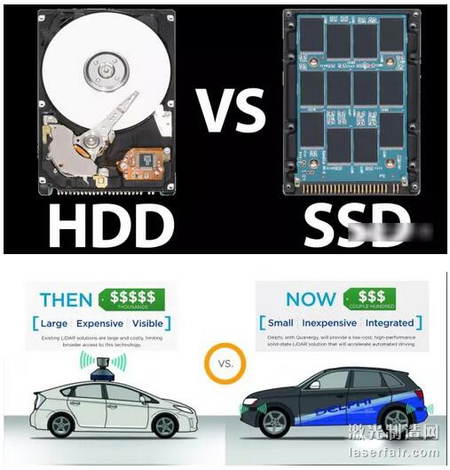 那么這里“固態(tài)”到底是個(gè)什么概念呢?難不成還對(duì)應(yīng)液態(tài)不成?實(shí)際上下圖一對(duì)應(yīng)了我們身邊最直接的例子,右側(cè)的“固態(tài)”硬盤SSD內(nèi)部沒有機(jī)械旋轉(zhuǎn)部件,所以體積小穩(wěn)定性高。對(duì)應(yīng)的左側(cè)“機(jī)械”硬盤HDD內(nèi)部基于機(jī)械旋轉(zhuǎn)部件進(jìn)行數(shù)據(jù)讀寫的方案。因此“固態(tài)”概念可以稱為基于電子部件,無機(jī)械旋轉(zhuǎn)部件的解決方案。如下圖二所示,左側(cè)最早由谷歌提出的無人駕駛汽車,基于置于車頂?shù)?60度機(jī)械旋轉(zhuǎn)激光雷達(dá)實(shí)現(xiàn)。它的性能非常好,但是相應(yīng)的也具有成本過高(幾千美元級(jí)別),體積大、外部可見等劣勢(shì)。右側(cè)對(duì)應(yīng)的“固態(tài)”激光雷達(dá)產(chǎn)品則由于采用電子方案去除了機(jī)械旋轉(zhuǎn)部件,因此具有低成本(幾百美元級(jí)別)和體積小、可集成至傳統(tǒng)車輛外觀中的特點(diǎn)。