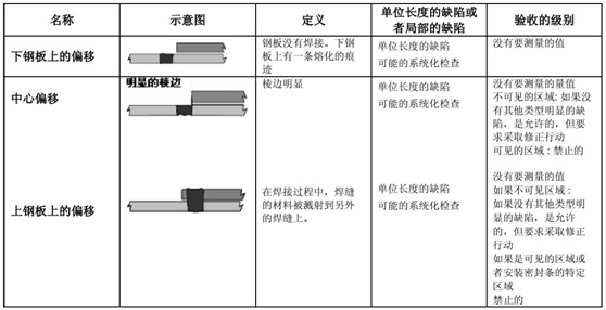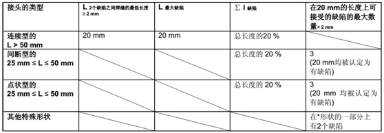 一個焊接接頭通常應針對不同缺陷類型分別進行評估,下表中規(guī)定了缺陷及限值。