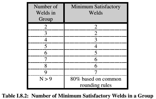 每段焊縫之間合格焊縫的段數(shù)標準,包括合格焊縫數(shù)量,當焊縫分段數(shù)量大于9時,要求段內(nèi)焊縫合格率達到80%。