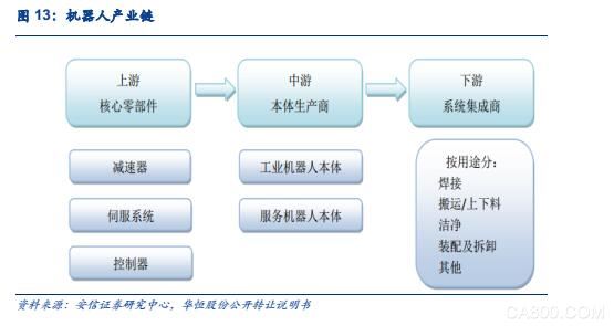 機器人自動化行業(yè)按產(chǎn)業(yè)鏈分為上游、中游和下游。上游生產(chǎn)核心零部件:包括減速器、伺服系統(tǒng)、控制器;中游是本體生產(chǎn)商,包括工業(yè)機器人本體、服務機器人本體。下游是系統(tǒng)集成商,包括單項系統(tǒng)集成商、綜合系統(tǒng)集成商。