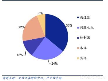 工業(yè)機器人優(yōu)于傳統(tǒng)的機械設(shè)備的原因主要在于上游的關(guān)鍵基礎(chǔ)部件。從結(jié)構(gòu)上來看,工業(yè)機器人由控制系統(tǒng)、驅(qū)動系統(tǒng)和執(zhí)行機構(gòu)組成,分別對應控制器、伺服電機和減速器等核心零部件。從成本上來看,核心零部件占工業(yè)機器人成本大頭,約72%左右。多軸工業(yè)機器人的成本構(gòu)成中,機械本體約占22%;伺服系統(tǒng)約占24%;減速器系統(tǒng)約占36%;控制系統(tǒng)約占12%;其他外設(shè)約占6%。