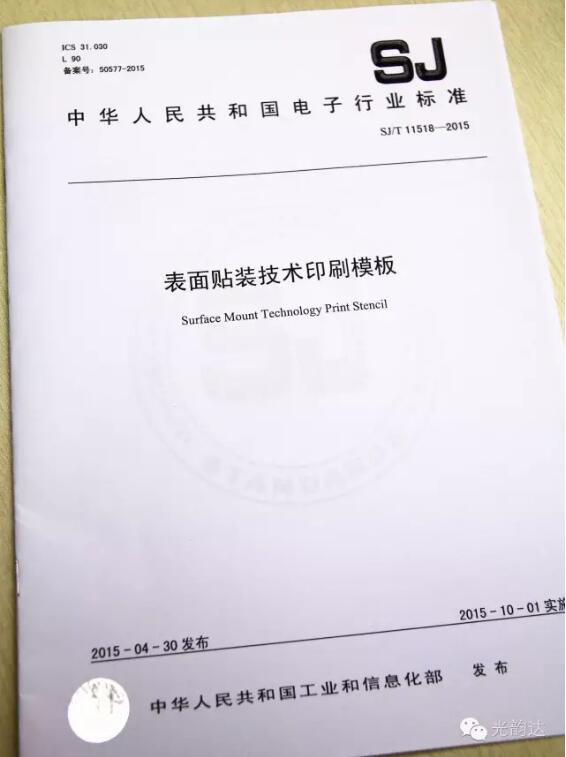 2015年, 中國工業(yè)和信息化部批準(zhǔn)了由深圳光韻達(dá)光電科技股份有限公司(股票代碼:300227.SZ)發(fā)起及起草制定的《表面貼裝技術(shù)印刷模板》行業(yè)標(biāo)準(zhǔn) ,認(rèn)可我公司在SMT模板制造行業(yè)的突出貢獻(xiàn),本標(biāo)準(zhǔn)也是目前經(jīng)國家部委認(rèn)定的首個(gè)表面貼裝印刷模板的相關(guān)規(guī)范。