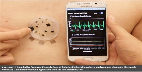 監(jiān)測(cè)心率、呼吸、肌肉運(yùn)動(dòng)等健康數(shù)據(jù)的電子皮膚(圖片來(lái)源:大邱慶北科學(xué)技術(shù)院)