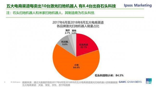 這份2017年6月——2018年8月五大電商渠道個(gè)品牌激光掃地機(jī)器人銷(xiāo)量占比數(shù)據(jù)顯示:小米掃地機(jī)器人占比64.4%,石頭科技掃地機(jī)器人占比20.1%,科沃斯掃地機(jī)器人占比9.8%,海爾掃地機(jī)器人占比2.7%,其他占比3%,可以說(shuō)小米和石頭科技成了最大贏家,直接占據(jù)了84.5%的市場(chǎng)份額。并且小米掃地機(jī)器人其實(shí)也是石頭科技制造的,也就是說(shuō)石頭科技間接占據(jù)了84.5%的份額,也就是說(shuō)每賣(mài)出10臺(tái)激光掃地機(jī)器人有8臺(tái)出自石頭科技,可以看出這個(gè)品牌的產(chǎn)品確實(shí)是很受消費(fèi)者喜歡!