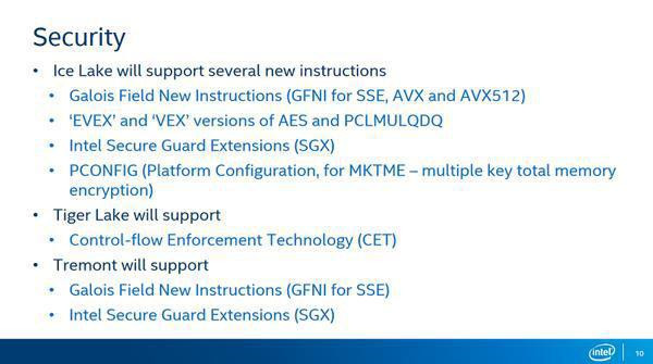 英特爾現階段的服務器處理器采用14nm工藝的Cascade Lake,主要增加DL Boost指令集加速AI性能;10nm工藝的Ice Lake則采用Sunny Cove新底層架構,可實現3x倍無線速度、2倍視頻轉碼速度、2倍圖形性能、3倍AI性能這些也是之前說過的了。Ice Lake處理器增加GFNI、SGX、PCFONFIG等指令;下一代的Tiger Lake會支持CET增強指令,Atom處理器中的下代Tremont架構也會增加SGX、GFNI等指令集。