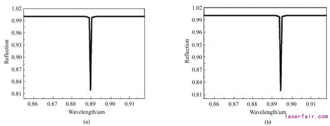 接下來(lái)我們以NSPG-VCSEL在微型原子鐘的應(yīng)用為例,研究其激射波長(zhǎng)在高溫工作環(huán)境下的穩(wěn)定性,圖6所示為NSPG-VCSEL上下DBR的反射譜線。在室溫環(huán)境下激射波長(zhǎng)在890.437 nm,通過(guò)采用-13.164 nm的失配量,在85 ℃(微型原子鐘的工作溫度)激射波長(zhǎng)達(dá)到894.62 nm。因此,在高溫工作環(huán)境中,器件能滿足工作波長(zhǎng)的要求。