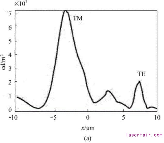 圖9(a)表示為整個(gè)器件出射光電場(chǎng)強(qiáng)度分布,圖9(b)顯示了整個(gè)器件不同角度的偏振分束光的電場(chǎng)強(qiáng)度分布(左邊為T(mén)M,右邊為T(mén)E),可以看出,當(dāng)894 nm波長(zhǎng)的光垂直入射光柵表面時(shí),非周期條形光柵的透射光波可實(shí)現(xiàn)30°、45°、60°不同角度的偏振分束。TM輸出端口的TM和TE偏振光的透射率分別為99.880%,0.096%、98.400%,0.094%、98.420%,0.094%;TE輸出端口的TE和TM偏振波的透射率分別為96.000%,0.090%、95.400%,0.090%、95.00%,0.087%。其中偏振角度為30°時(shí),偏振透射效果最佳,實(shí)現(xiàn)消光比>30 dB,光功率達(dá)到1.997 mW。NSPG-VCSEL與其他基于亞波長(zhǎng)光柵結(jié)構(gòu)的VCSEL相比,避免了TE部分的偏振光反射回激光器腔中參與振蕩,對(duì)激光器原先固有的性能造成影響,實(shí)現(xiàn)了偏振分束光柵將TM與TE偏振光同時(shí)透射,本器件消光比>30dB,與同類基于亞波長(zhǎng)光柵的VCSEL結(jié)構(gòu)的20 dB相比具有很大幅度提升,說(shuō)明該結(jié)構(gòu)具有優(yōu)越的偏振分束功能,有利于器件的高效集成,降低了器件集成的復(fù)雜度與成本,在微光學(xué)集成系統(tǒng)以及微光機(jī)電系統(tǒng)具有很好的應(yīng)用前景。