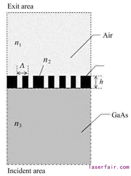 為驗(yàn)證所設(shè)計(jì)光柵的匯聚及偏振性能,采用COMSOLMULTIPHYSICS多物理有限元分析軟件對(duì)其偏振特性進(jìn)行仿真,圖7為器件的仿真理論模型圖,入射波長(zhǎng)為894 nm,AlGaAs折射率為n 2 = 3.565,空氣折射率n 1 = 1,光柵的厚度為120 nm。