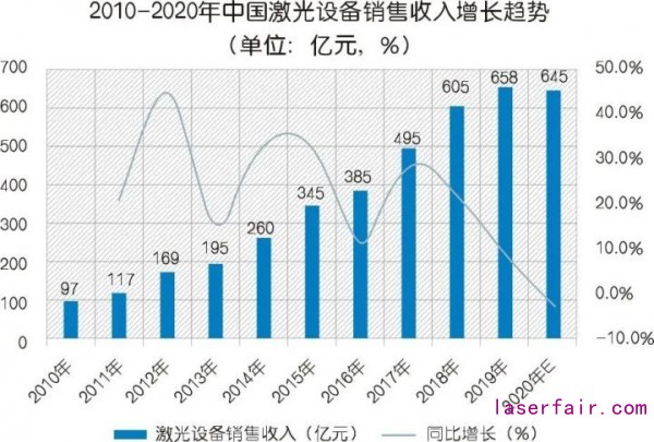 2019年激光市場雖然有所增長,但與前兩年相比增速開始放緩,全部領(lǐng)域的激光設(shè)備(含進(jìn)口)市場銷售收入為658億元,同比增長8.8%。受全球經(jīng)濟(jì)走勢不確定的影響,預(yù)計(jì)2020年中國激光設(shè)備市場整體銷售收入為645億元,將出現(xiàn)近十年來首次負(fù)增長,但其前景依然廣闊,絕對量不小。