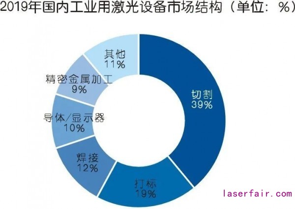 工業(yè)激光設(shè)備市場中,激光切割應(yīng)用最為廣泛,占比達(dá)到39%,打標(biāo)與焊接分列第二、三位,占比分別為19%、12%。