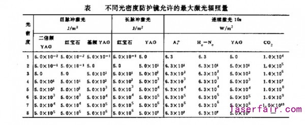 GJB1762-93中還展示了不同光密度防護鏡對應(yīng)不同類型的激光的最大激光輻射量: