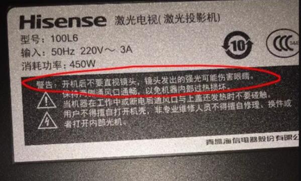 因?yàn)槭羌す饧夹g(shù),發(fā)出的強(qiáng)光會(huì)傷害眼睛,所以激光電視的鏡頭在開機(jī)后是不能直視,這對用戶家中的小朋友是一個(gè)潛在的危險(xiǎn),因?yàn)椴欢碌男『⒆油耆锌赡艹鲇诤闷鎸⒀劬惖街鳈C(jī)鏡頭與抗光幕布之間的空隙。如海信就在其激光電視上明確標(biāo)注,“開機(jī)后不要直視鏡頭,鏡頭發(fā)出的強(qiáng)光可能傷害眼睛。”