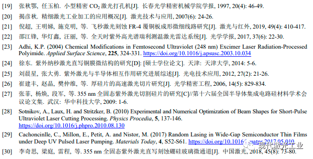 近幾年來,紫外激光對半導(dǎo)體材料的微加工受到了越來越多的關(guān)注。成千上萬的密集電路元件在集 成電路中非常常見,所以就需要一些高精密的處理和加工方法[28],還有一些高精儀器和器件的硅和藍(lán)寶 石等半導(dǎo)體材料等半導(dǎo)體薄膜的精密微加工靠紫外激光且研究薄膜的光譜特性[29],同時(shí)紫外激光還可以 加大硅材料對光能的利用率,也可以使得硅表面的微結(jié)構(gòu)發(fā)生改變,有利于太陽能電池板的研發(fā),如二 維微光柵等。