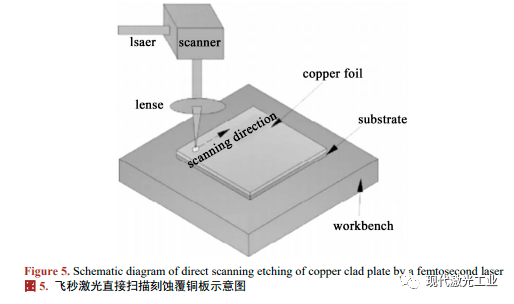 在工業(yè)領(lǐng)域中多種電路板的生產(chǎn)制作過程,從最開始的布線到生產(chǎn)成需要高級工藝的微小精密的嵌入式芯片,集成電路板內(nèi)的柔性電路、聚合物和銅的層布式電路都需要鉆微孔和切割[17],也包括電路板上材料的修復(fù)和檢測,常需要用到等微細(xì)加工和處理。電路板加工中激光微加工技術(shù)顯然成為最佳選擇。激光在加工過程中,工作機(jī)器不與被加工產(chǎn)品接觸,有效避免機(jī)械作用力,加工迅速,靈活性高,并且對工作場合無需特殊要求,通過對激光參數(shù)的精準(zhǔn)設(shè)置和研究設(shè)計(jì),可以達(dá)到微米以下量級[18]。電路板上用的比較傳統(tǒng)的鉆孔方式是利用紫外激光器和 CO2激光器用于非金屬打標(biāo)(波長為 10.6 μm 的 CO2激光器用于非金屬材料打標(biāo);波長 1064 nm 或者 532 nm 一般用于金屬材料打標(biāo)[19])。目前還是主要采用紫外激光加工技術(shù),可以達(dá)到微米級的加工,精確度高,可以制作超細(xì)微零器件,可以應(yīng)用于小于 1 μm 光斑 的激光束的微孔加工。但是 CO2 激光器主要打 75~150 mm 的孔,且小孔易錯(cuò)位,而紫外激光器可以打 25 mm 以下的孔,精度高且不會錯(cuò)位[20]。例如在用紫外飛秒激光“冷”加工覆銅線路板中利用綜合平 衡法得到最優(yōu)工藝參數(shù),再用選擇性刻蝕的特性達(dá)到高質(zhì)量、高效率線寬 50 μm、線間距 20 μm 的覆銅 板表面微細(xì)線路刻蝕加工[21]如圖 4 和圖 5 所示。