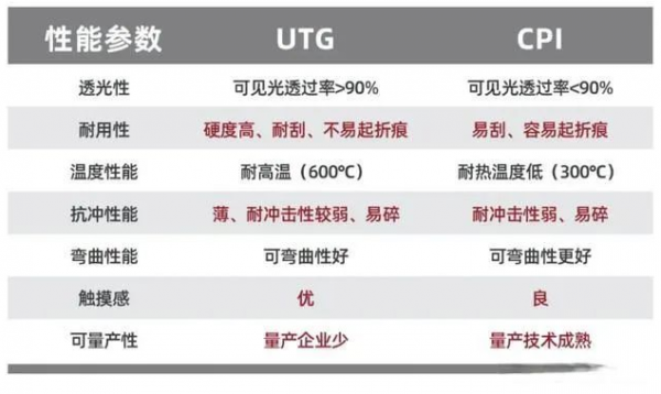 柔性蓋板是折疊手機(jī)的核心材料,而CPI屏幕雖然很薄、很軟,但是亮度很低,屏幕透光性不好且屏幕并不平整,折痕也大。整體的觀感一般,UTG玻璃屏幕則就不會出現(xiàn)這些問題,CPI →UTG是大方向。