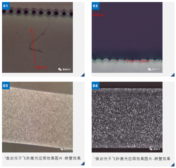 奧創(chuàng)光子飛秒激光應(yīng)用效果如上圖-光斑均勻,放大后,側(cè)壁質(zhì)量表面無明顯熱裂紋及影響區(qū),因此點與點之間幾乎無影響,點間距可以做到非常小。材料內(nèi)部已經(jīng)完美裂開,從而實現(xiàn)較小的崩邊1um左右的崩邊。