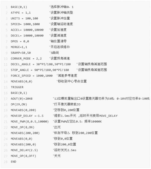 (2)激光控制:通過LASER、支持PWM功能的OUT輸出口或者EXIO擴(kuò)展接口連接市面上常用的多種類型的激光器。使用MOVE_OP指令控制激光開關(guān),MOVE_PWM指令調(diào)節(jié)激光的頻率和占空比,另外還有MOVE_DELAY指令和MOVEOP_DELAY指令控制開關(guān)光的延時。