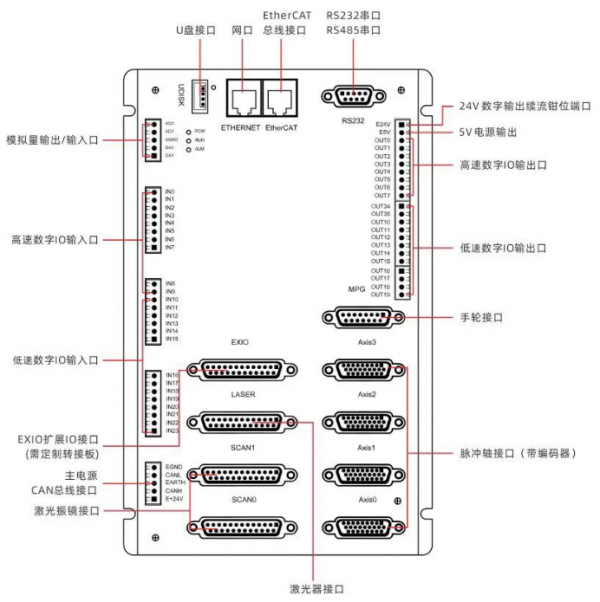 (4)自帶LASER激光器控制接口,支持支持IPG、YLR、YLS等類型激光電源,還帶一個EXIO擴(kuò)展IO接口,通過定制轉(zhuǎn)接板,靈活控制市場上主流的各種激光器;
