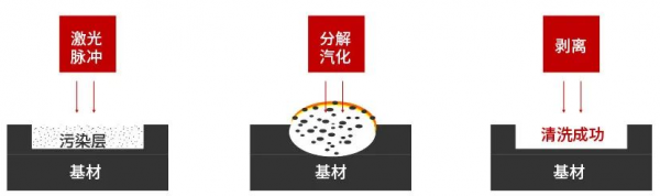 激光清洗原理:利用高功率密度的激光作用于待清洗的工件表面(非接觸),工件表面污染物吸收聚焦的激光能量后,迅速膨脹、汽化、剝離,從而脫離工件表面達(dá)到清洗的目的。