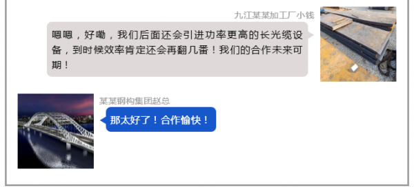 其次,根據(jù)實(shí)際應(yīng)用的需求,大量的工件要兩塊金屬板拼接后使用,以往的操作都是需要切割好孔位之后,用戶再回去進(jìn)行焊接拼合,既要對(duì)準(zhǔn)孔位,又要防止焊接過(guò)程產(chǎn)生熱效應(yīng)發(fā)生形變等一系列問(wèn)題的發(fā)生,效率極其低下,有過(guò)5天僅拼合8張板的“記錄”。引進(jìn)大幅面長(zhǎng)光纜的黃金CP后,用戶可以先進(jìn)行焊接工序,拼合后的板材長(zhǎng)度超過(guò)了18米,在黃金組合的機(jī)床上也能輕松實(shí)現(xiàn)批量切割。焊后切,裝配精度高,減少了材料運(yùn)輸成本,大大提高了加工效率。超長(zhǎng)光纜的前提必須是應(yīng)用性能的保證,這個(gè)痛點(diǎn)問(wèn)題的妥善解決真正讓用戶體會(huì)到了飛博激光超長(zhǎng)光纜高附加值產(chǎn)品帶來(lái)的實(shí)際意義。
