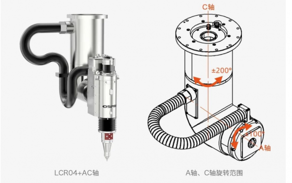 A軸的旋轉(zhuǎn)范圍為±100°,C軸的旋轉(zhuǎn)范圍為±200°,這意味著切割頭可以在水平和豎直方向上進(jìn)行旋轉(zhuǎn),雙軸配合在斜向方向上進(jìn)行傾斜,從而實(shí)現(xiàn)更多樣化的加工形式。