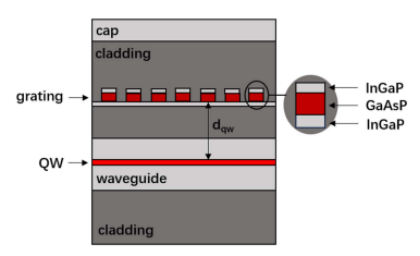 光柵區(qū)域采用了低損耗、低應(yīng)力的三層InGaP/InGaAsP/InGaP結(jié)構(gòu),避免了傳統(tǒng)材料(如GaAsP)中因應(yīng)力導(dǎo)致的光柵吸收和缺陷問題。優(yōu)化的二次外延工藝進(jìn)一步減少了界面氧污染,使氧含量降至1E16數(shù)量級,大幅提升了器件效率和可靠性。