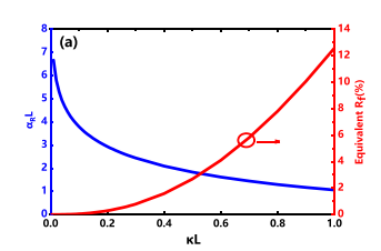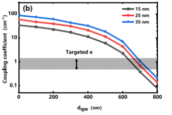 該研究團(tuán)隊基于耦合模理論(CMT)構(gòu)建了光柵分析模型,通過調(diào)整光柵耦合強度(κL控制在0.4-0.6之間)和光柵與量子阱的相對位置,計算結(jié)果如圖2所示,較小的光柵耦合系數(shù)會帶來外耦合光的比例增加,從而提高功率和效率。較遠(yuǎn)的光柵位置顯著降低了光損耗和載流子復(fù)合的影響,確保了較高的輸出功率和低電壓。