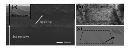 圖3  (a) DFB在外延方向的橫截面和光柵的掃描電鏡(SEM)圖像,標(biāo)記了二次外延的開始。插圖顯示了光柵的放大視圖。(b)lnGaAsP光柵的透射電鏡圖像,(c)傅里葉變換后的高分辨率圖像。