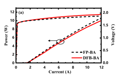 圖5 (a) 780 nm DFB-BA激光器(實線)和FP-BA激光器(虛線)的性能進(jìn)行比較,采用相同的垂直設(shè)計,在散熱器溫度為20“C的條件下進(jìn)行測試。(b)在12a電流下,光譜圖