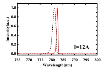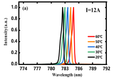 研究人員在12 A電流和20 °C溫控下對器件進(jìn)行了性能測試,如下圖5和圖6所示,激光器實現(xiàn)了連續(xù)輸出功率超過10 W,光譜寬度(FWHM)小于0.5 nm。這一功率水平創(chuàng)下了780 nm波段DFB激光器的最高紀(jì)錄,同時在寬電流與溫度范圍內(nèi)保持了良好的鎖波特性。