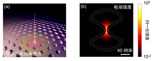 奇點介電納米激光器示意圖(a),激光器電場強度分布圖(b)。圖源:北京大學新聞網(wǎng)