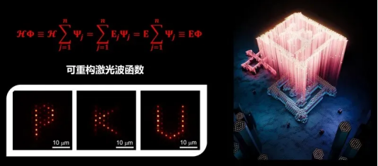 為解決這一難題,團隊進一步利用納米激光器構(gòu)建出有源光頻相控陣,實現(xiàn)了激光陣列的相干輸出與精確調(diào)控。無需外部鎖相,該系統(tǒng)可自發(fā)實現(xiàn)陣列內(nèi)相位同步,按需輸出“P”“K”“U”和“中”“國”等任意圖形的相干激射圖案。通過進一步調(diào)控各區(qū)域激光器的相對相位,還能精準控制整體發(fā)射方向,實現(xiàn)光頻段的動態(tài)波束掃描。