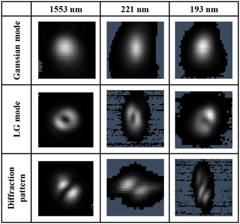 高斯模式、LG模式和由熱電相機(jī)記錄的1553、221和193nm激光器的渦旋光束的衍射圖案。