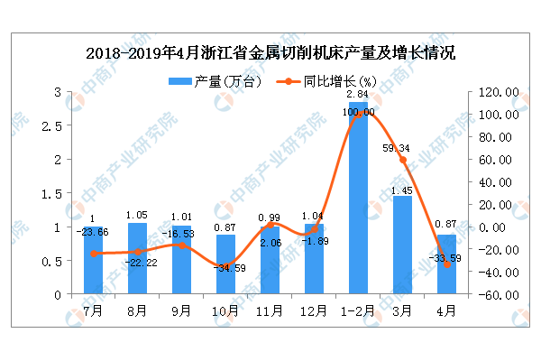 2019年1-4月浙江省金屬切削機床產(chǎn)量同比下降2.2%