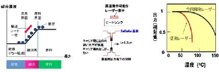 圖:新結(jié)晶成長法的原理(左)新開發(fā)的激光器的結(jié)構(gòu)(中間)比較輸出溫度依存性的概念圖(右)