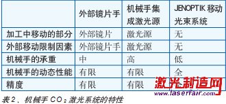 在Jenoptik自動化技術公司,基于機械手的新一代CO2 激光系統(tǒng)已經(jīng)誕生(其特性見表2),其激光功率能高達5000W,且具備更高精度和動態(tài)性能。在該系統(tǒng)中激光器以機械方式同機械手分離。通過與St ubli公司的合作,激光束現(xiàn)在能以光學方式同機械手底部相連,從而將完整的激光束光路集成至激光頭的尖端。