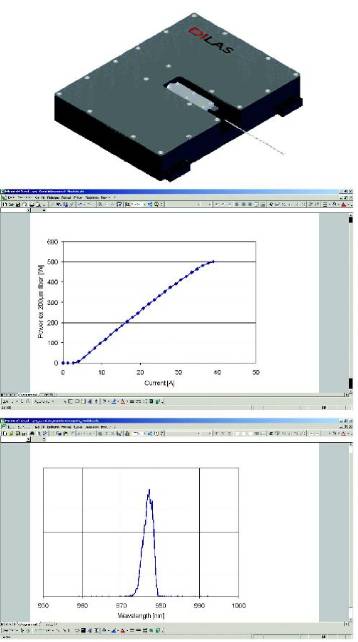 圖: 采用T-BAR  500W@200um 976nm 傳導冷卻光纖耦合模塊和測試數(shù)據(jù)